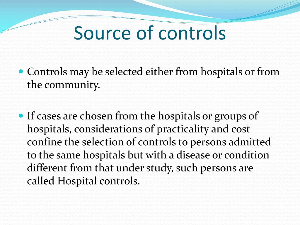 Source of controls • Controls may be selected either from hospitals or from the community. • If cases are chosen from the hospitals or groups of hospitals, considerations of practicality and cost confine the selection of controls to persons admitted to the same hospitals but with a disease or condition different from that under study, such persons are called Hospital controls.