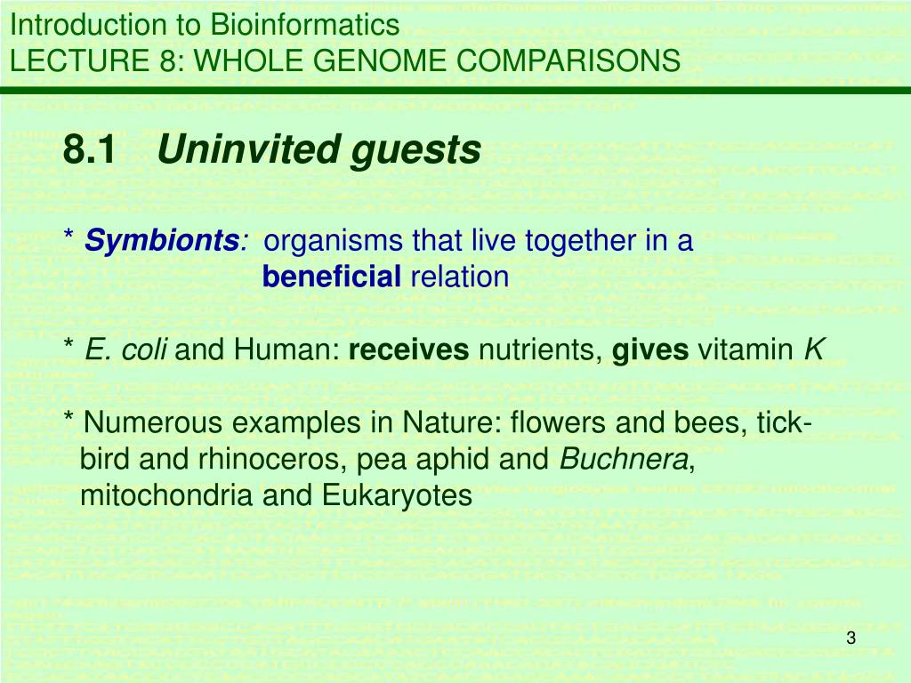 Introduction to BioinformaticsLECTURE 8: WHOLE GENOME COMPARISONS • 8.1 Uninvited guests • * Symbionts: organisms that live together in a beneficialrelation • * E. coli and Human: receives nutrients, gives vitamin K • * Numerous examples in Nature: flowers and bees, tick- bird and rhinoceros, pea aphid and Buchnera, mitochondria and Eukaryotes