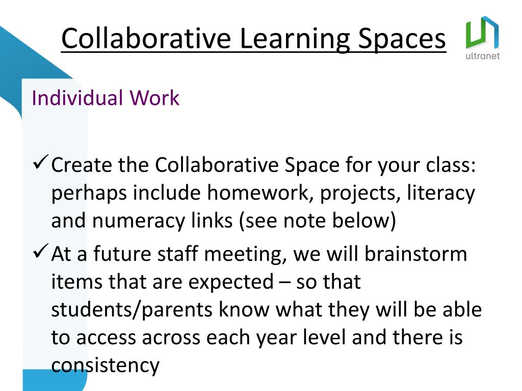 Individual Work Create the Collaborative Space for your class: perhaps include homework, projects, literacy and numeracy links (see note below) At a future staff meeting, we will brainstorm items that are expected – so that students/parents know what they will be able to access across each year level and there is consistency Collaborative Learning Spaces