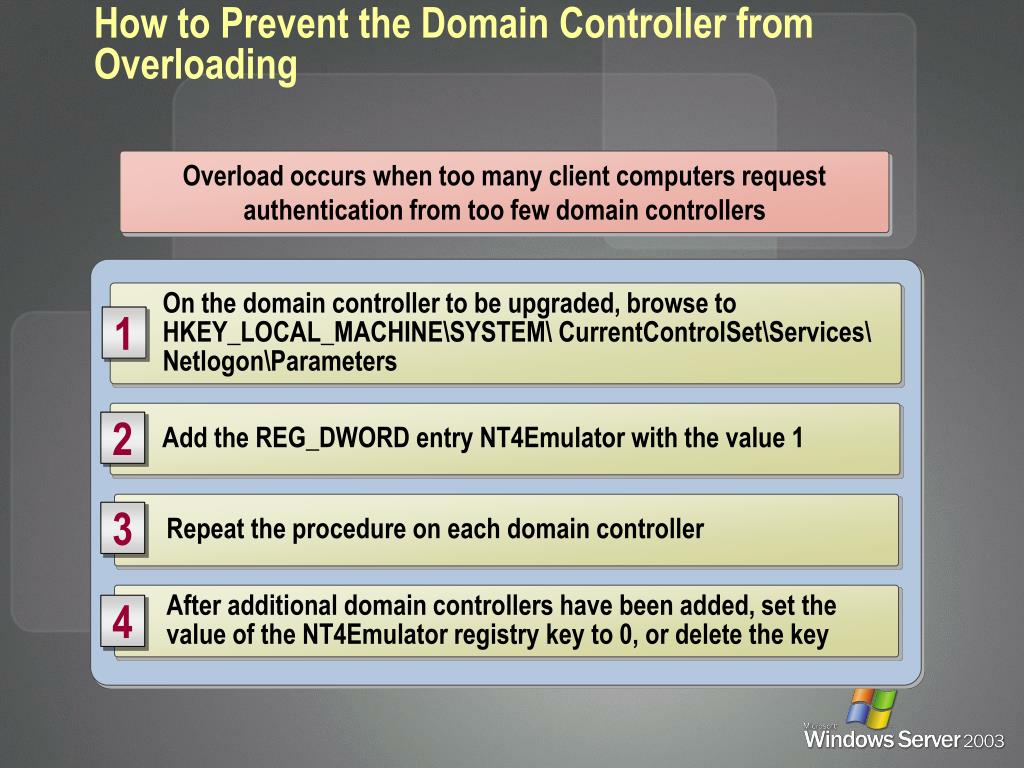 On the domain controller to be upgraded, browse to HKEY_LOCAL_MACHINE\SYSTEM\ CurrentControlSet\Services\Netlogon\Parameters 1 Add the REG_DWORD entry NT4Emulator with the value 1 2 Repeat the procedure on each domain controller 3 After additional domain controllers have been added, set the value of the NT4Emulator registry key to 0, or delete the key 4 How to Prevent the Domain Controller from Overloading Overload occurs when too many client computers request authentication from too few domain controllers