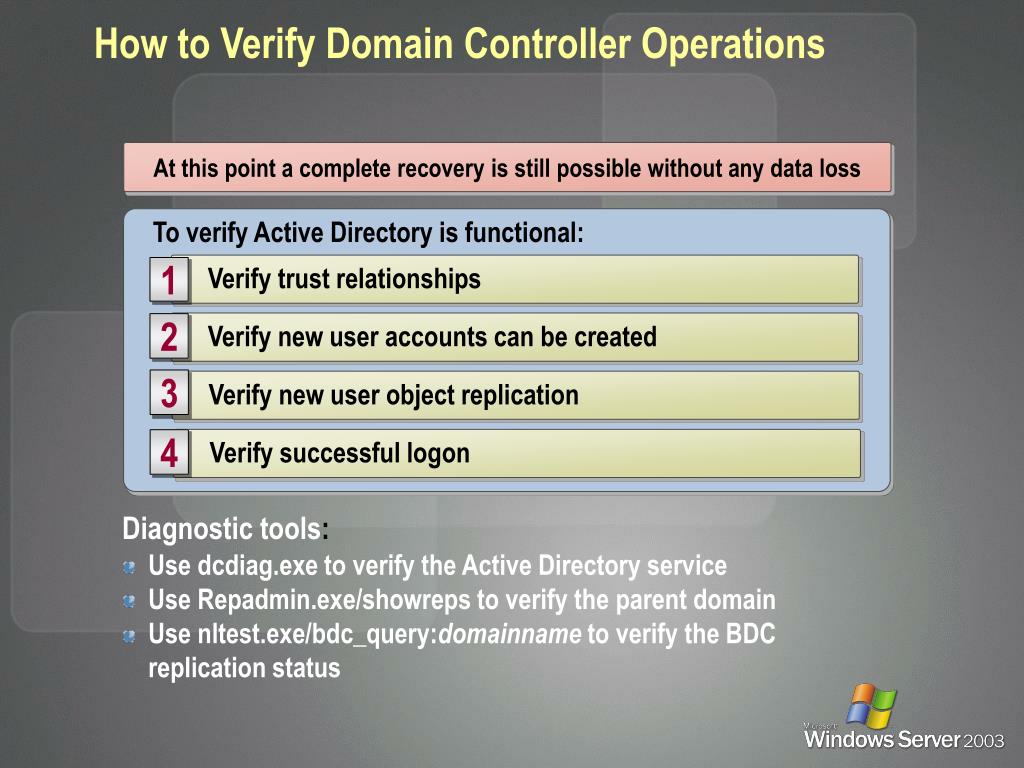 How to Verify Domain Controller Operations At this point a complete recovery is still possible without any data loss To verify Active Directory is functional: Verify trust relationships 1 Verify new user accounts can be created 2 3 Verify new user object replication Verify successful logon 4 Diagnostic tools: • Use dcdiag.exe to verify the Active Directory service • Use Repadmin.exe/showreps to verify the parent domain • Use nltest.exe/bdc_query:domainname to verify the BDC replication status