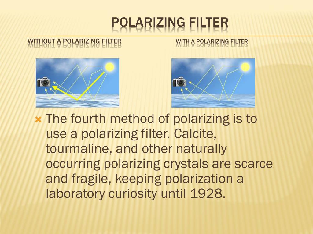 The fourth method of polarizing is to use a polarizing filter. Calcite, tourmaline, and other naturally occurring polarizing crystals are scarce and fragile, keeping polarization a laboratory curiosity until 1928. polarizing filterWithout a Polarizing Filter With a Polarizing Filter