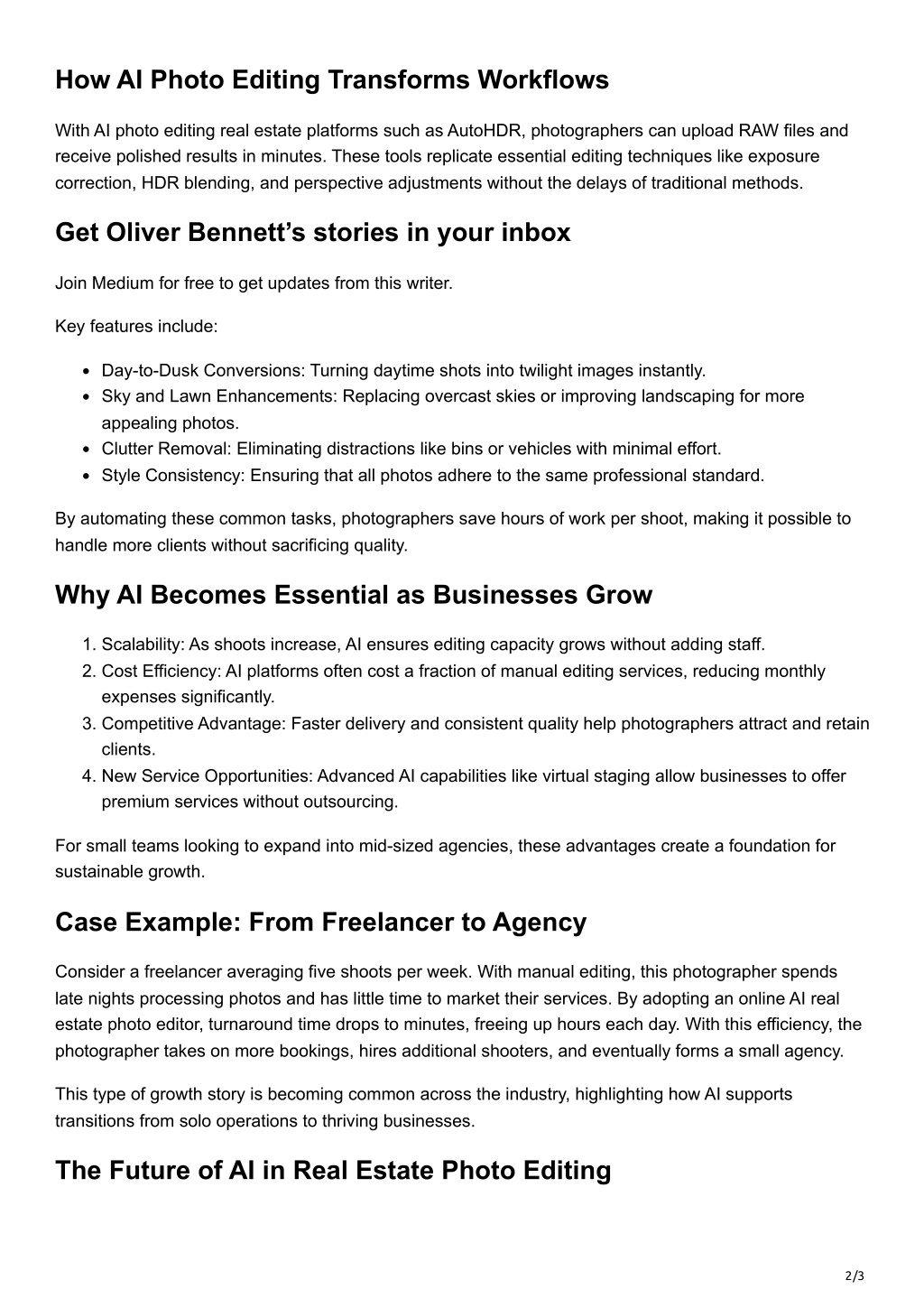 How AI Photo Editing Transforms Workflows With AI photo editing real estate platforms such as AutoHDR, photographers can upload RAW files and receive polished results in minutes. These tools replicate essential editing techniques like exposure correction, HDR blending, and perspective adjustments without the delays of traditional methods. Get Oliver Bennett’s stories in your inbox Join Medium for free to get updates from this writer. Key features include: Day-to-Dusk Conversions: Turning daytime shots into twilight images instantly. Sky and Lawn Enhancements: Replacing overcast skies or improving landscaping for more appealing photos. Clutter Removal: Eliminating distractions like bins or vehicles with minimal effort. Style Consistency: Ensuring that all photos adhere to the same professional standard. By automating these common tasks, photographers save hours of work per shoot, making it possible to handle more clients without sacrificing quality. Why AI Becomes Essential as Businesses Grow 1. Scalability: As shoots increase, AI ensures editing capacity grows without adding staff. 2. Cost Efficiency: AI platforms often cost a fraction of manual editing services, reducing monthly expenses significantly. 3. Competitive Advantage: Faster delivery and consistent quality help photographers attract and retain clients. 4. New Service Opportunities: Advanced AI capabilities like virtual staging allow businesses to offer premium services without outsourcing. For small teams looking to expand into mid-sized agencies, these advantages create a foundation for sustainable growth. Case Example: From Freelancer to Agency Consider a freelancer averaging five shoots per week. With manual editing, this photographer spends late nights processing photos and has little time to market their services. By adopting an online AI real estate photo editor, turnaround time drops to minutes, freeing up hours each day. With this efficiency, the photographer takes on more bookings, hires additional shooters, and eventually forms a small agency. This type of growth story is becoming common across the industry, highlighting how AI supports transitions from solo operations to thriving businesses. The Future of AI in Real Estate Photo Editing 2/3