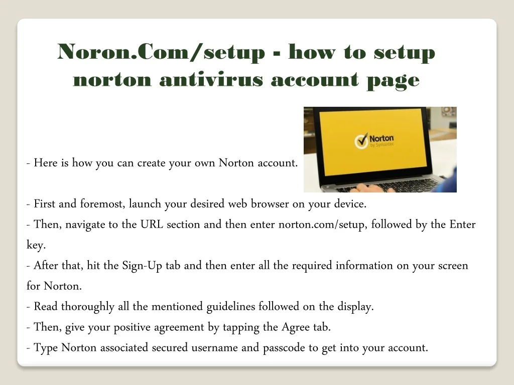 Noron.Com/setup - how to setup norton antivirus account page - Here is how you can create your own Norton account. - First and foremost, launch your desired web browser on your device. - Then, navigate to the URL section and then enter norton.com/setup, followed by the Enter key. - After that, hit the Sign-Up tab and then enter all the required information on your screen for Norton. - Read thoroughly all the mentioned guidelines followed on the display. - Then, give your positive agreement by tapping the Agree tab. - Type Norton associated secured username and passcode to get into your account.