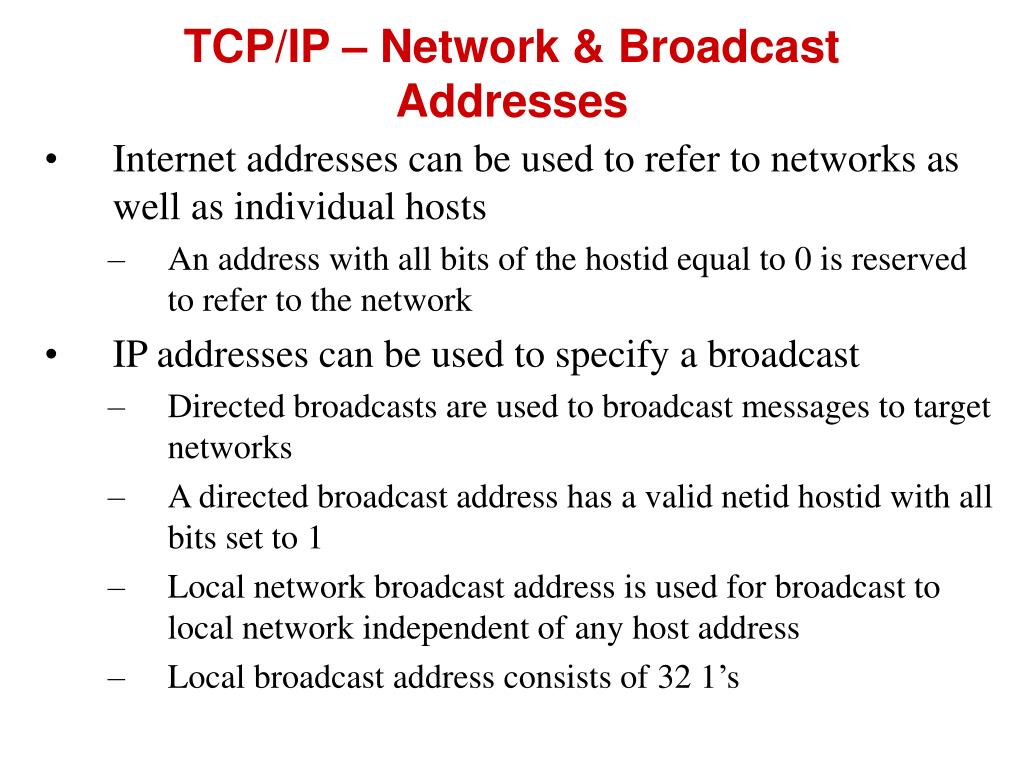 TCP/IP – Network & Broadcast Addresses • Internet addresses can be used to refer to networks as well as individual hosts • An address with all bits of the hostid equal to 0 is reserved to refer to the network • IP addresses can be used to specify a broadcast • Directed broadcasts are used to broadcast messages to target networks • A directed broadcast address has a valid netid hostid with all bits set to 1 • Local network broadcast address is used for broadcast to local network independent of any host address • Local broadcast address consists of 32 1’s