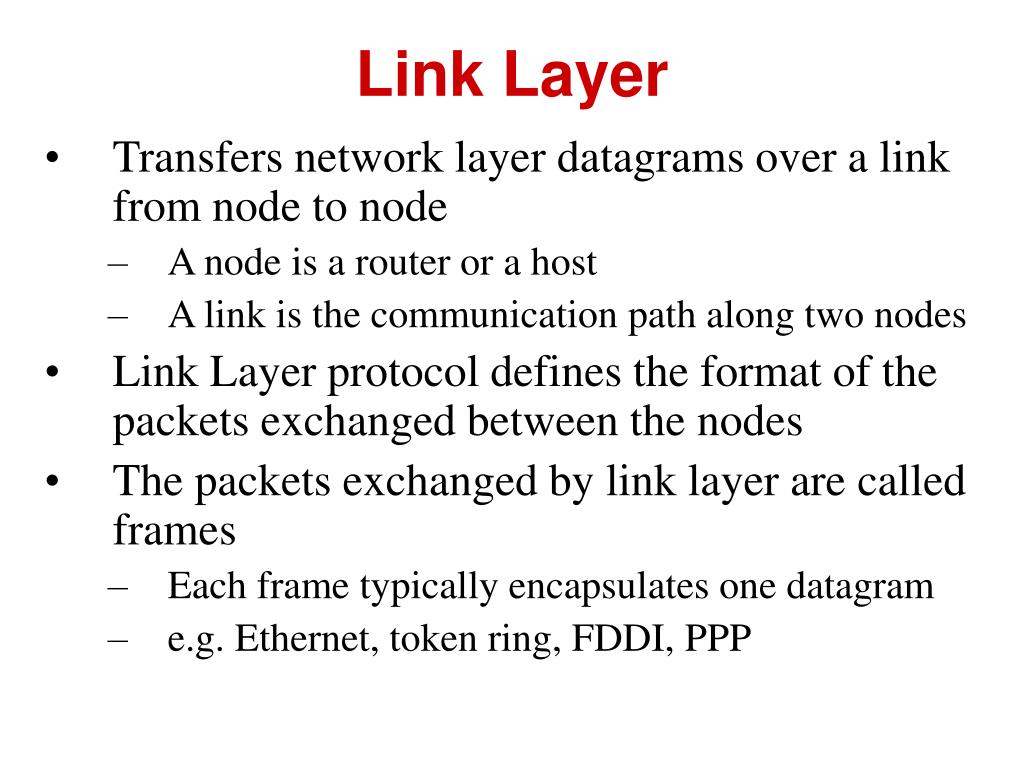 Link Layer • Transfers network layer datagrams over a link from node to node • A node is a router or a host • A link is the communication path along two nodes • Link Layer protocol defines the format of the packets exchanged between the nodes • The packets exchanged by link layer are called frames • Each frame typically encapsulates one datagram • e.g. Ethernet, token ring, FDDI, PPP