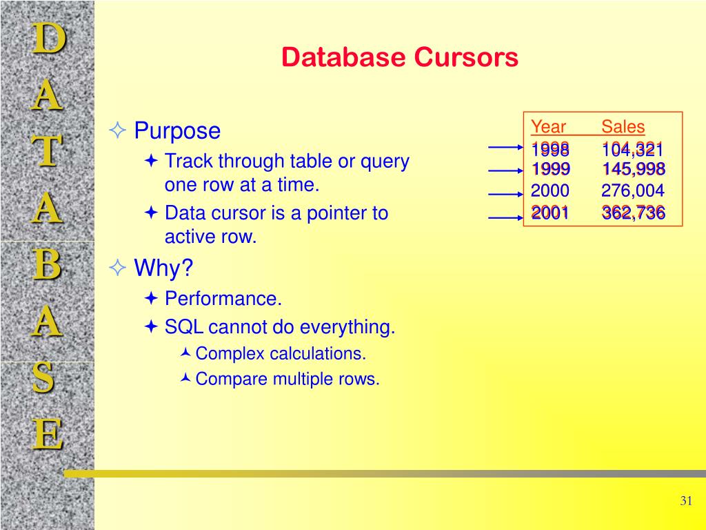 Purpose Track through table or query one row at a time. Data cursor is a pointer to active row. Why? Performance. SQL cannot do everything. Complex calculations. Compare multiple rows. Database Cursors Year Sales 1998 104,321 1999 145,998 2000 276,004 2001 362,736 1998 104,321 1999 145,998 2000 276,004 2001 362,736