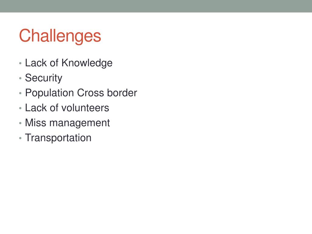 Challenges • Lack of Knowledge • Security • Population Cross border • Lack of volunteers • Miss management • Transportation