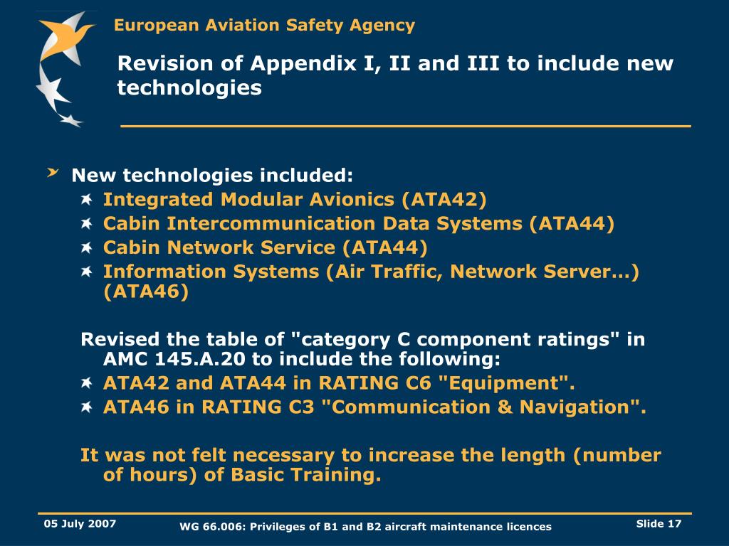 Revision of Appendix I, II and III to include new technologies • New technologies included: • Integrated Modular Avionics (ATA42) • Cabin Intercommunication Data Systems (ATA44) • Cabin Network Service (ATA44) • Information Systems (Air Traffic, Network Server…) (ATA46) Revised the table of "category C component ratings" in AMC 145.A.20 to include the following: • ATA42 and ATA44 in RATING C6 "Equipment". • ATA46 in RATING C3 "Communication & Navigation". It was not felt necessary to increase the length (number of hours) of Basic Training. WG 66.006: Privileges of B1 and B2 aircraft maintenance licences
