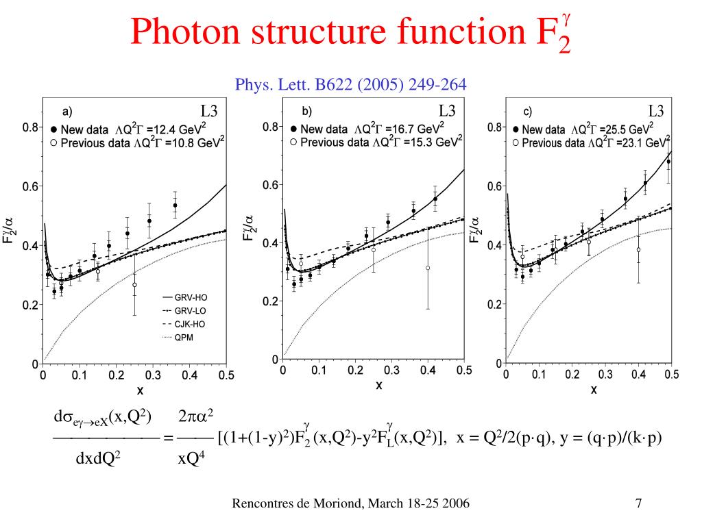 Photon structure function F2 Phys. Lett. B622 (2005) 249-264 deeX(x,Q2) 22 = [(1+(1-y)2)F2(x,Q2)-y2FL(x,Q2)], x = Q2/2(p·q), y = (q·p)/(k·p) dxdQ2 xQ4 Rencontres de Moriond, March 18-25 2006