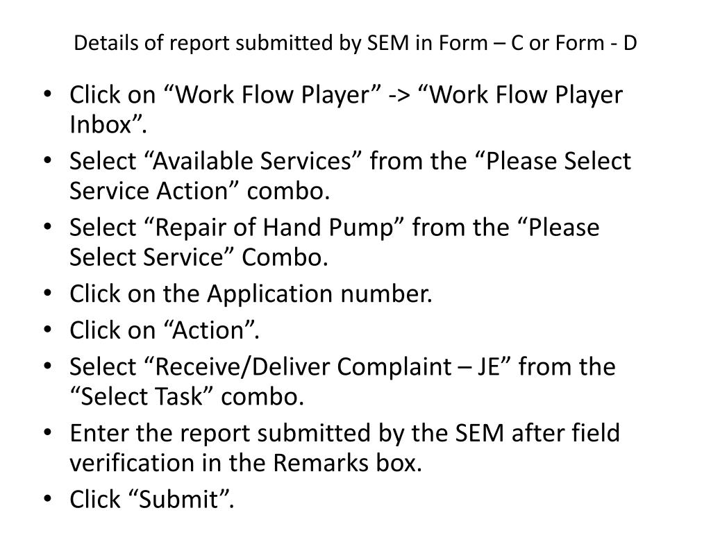 Details of report submitted by SEM in Form – C or Form - D • Click on “Work Flow Player” -> “Work Flow Player Inbox”. • Select “Available Services” from the “Please Select Service Action” combo. • Select “Repair of Hand Pump” from the “Please Select Service” Combo. • Click on the Application number. • Click on “Action”. • Select “Receive/Deliver Complaint – JE” from the “Select Task” combo. • Enter the report submitted by the SEM after field verification in the Remarks box. • Click “Submit”.