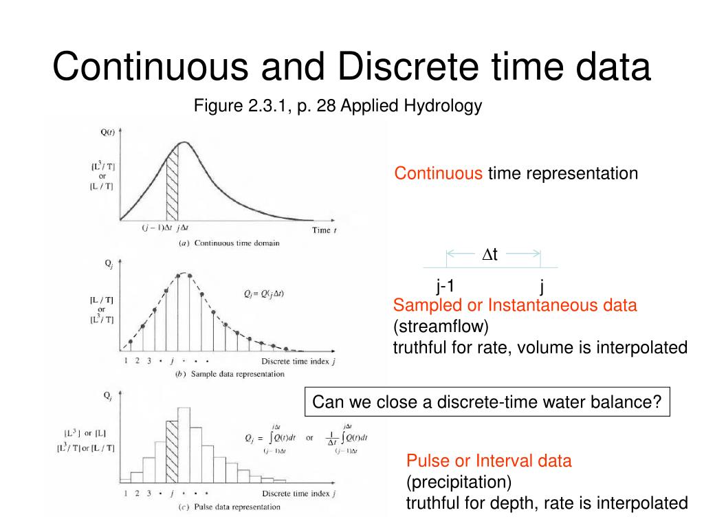 Continuous and Discrete time data Figure 2.3.1, p. 28 Applied Hydrology Continuous time representation Dt j-1 j Sampled or Instantaneous data (streamflow) truthful for rate, volume is interpolated Can we close a discrete-time water balance? Pulse or Interval data (precipitation) truthful for depth, rate is interpolated