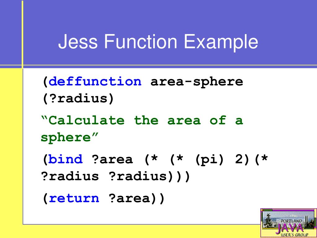 Jess Function Example How do we use this in Jess? (printout t "The surface area of a radius = 2 meter sphere is " + (area-sphere 2) + " m^2")