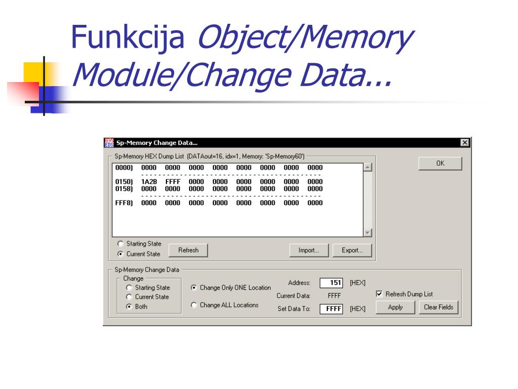 Skup funkcija za rad sa sadržajem memorijskih modula(Object/Memory Module) • HEX Dump List... – funkcija za otvaranje dijaloga za pregled sadržaja memorijskih lokacija memorijskog modula • Change Data... – funkcija za otvaranje dijaloga za pregled i modifikaciju sadržaja memorijskih lokacija memorijskog modula • Import Memory Data.../Export Memory Data... – dijalog za učitavanje ili snimanje sadržaja memorijskih lokacija u datoteku.