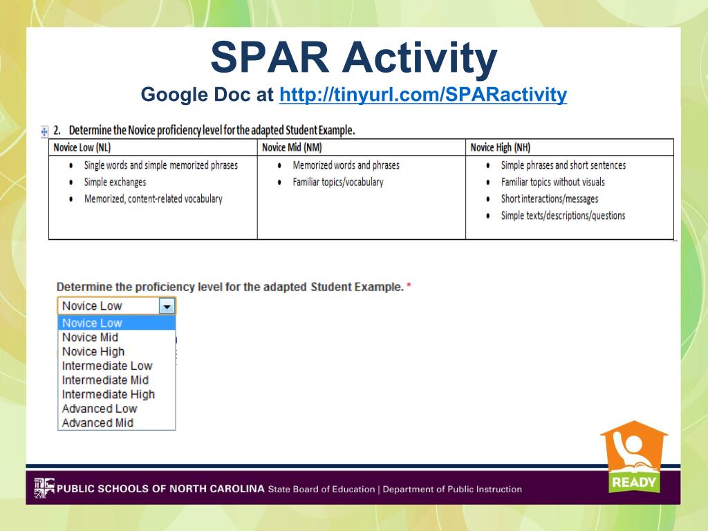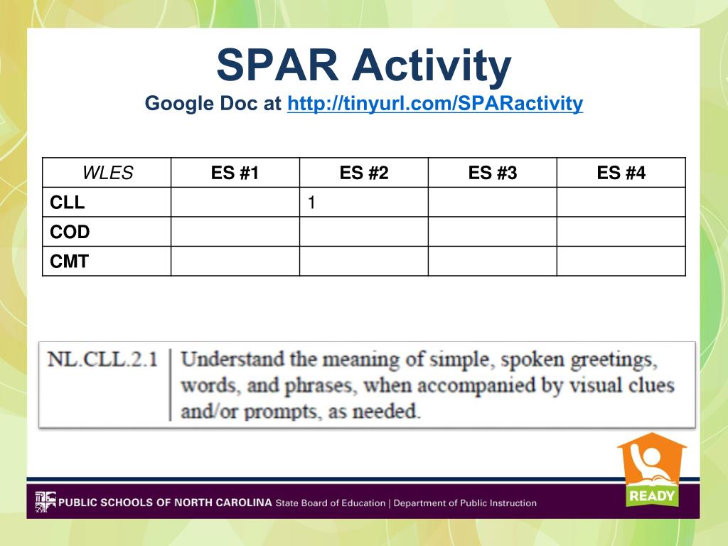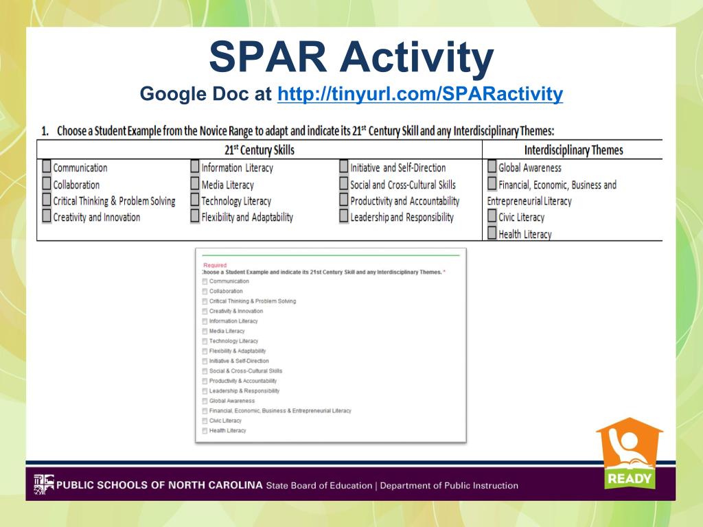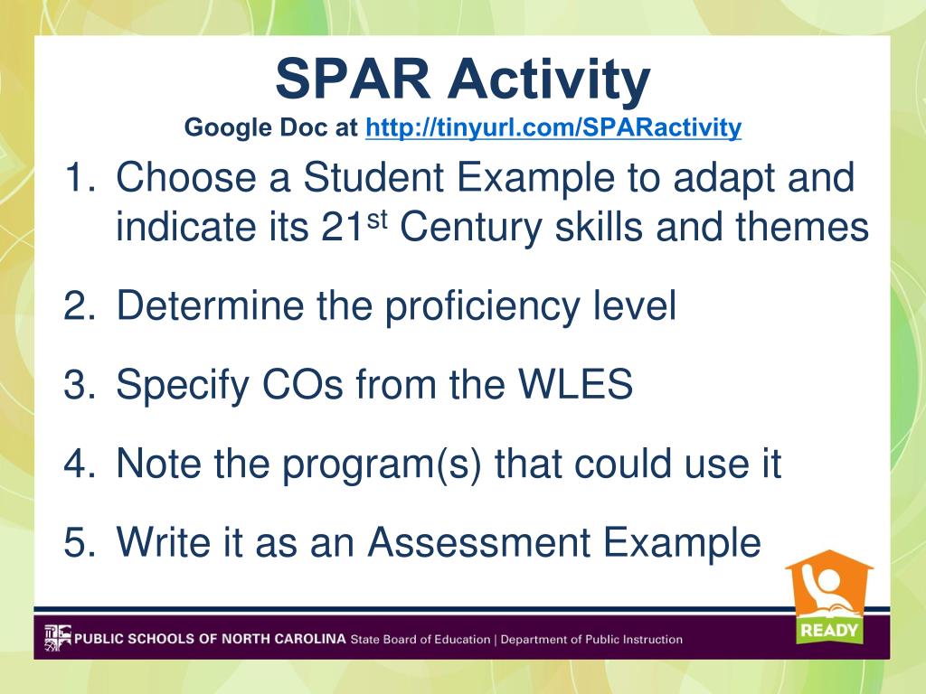 SPAR ActivityGoogle Doc at http://tinyurl.com/SPARactivity • Choose a Student Example to adapt and indicate its 21st Century skills and themes • Determine the proficiency level • Specify COs from the WLES • Note the program(s) that could use it • Write it as an Assessment Example