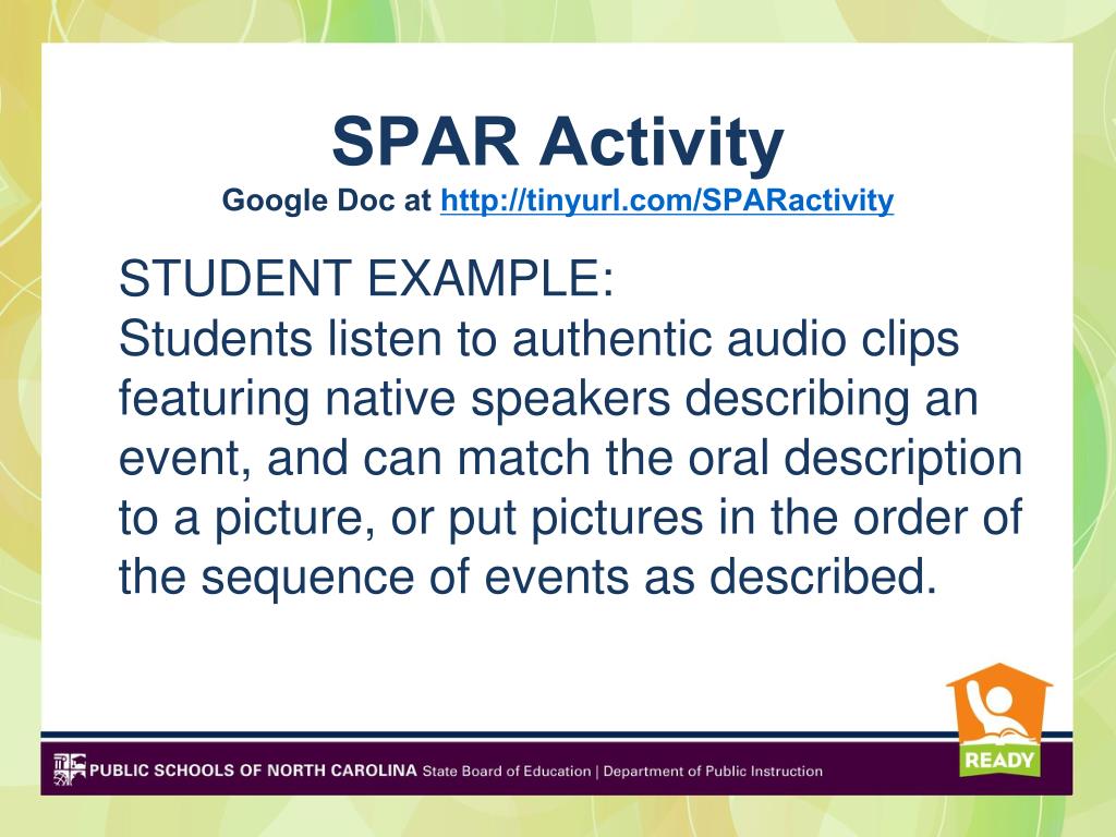 SPAR ActivityGoogle Doc at http://tinyurl.com/SPARactivity STUDENT EXAMPLE: Students listen to authentic audio clips featuring native speakers describing an event, and can match the oral description to a picture, or put pictures in the order of the sequence of events as described.