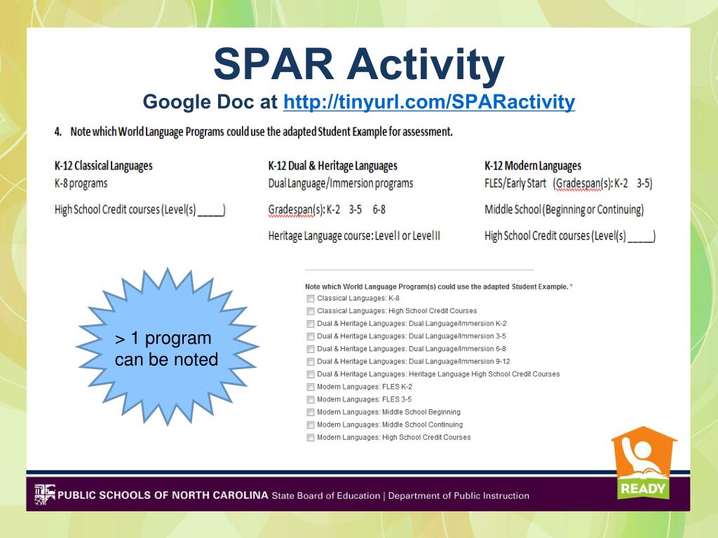 SPAR ActivityGoogle Doc at http://tinyurl.com/SPARactivity > 1 program can be noted
