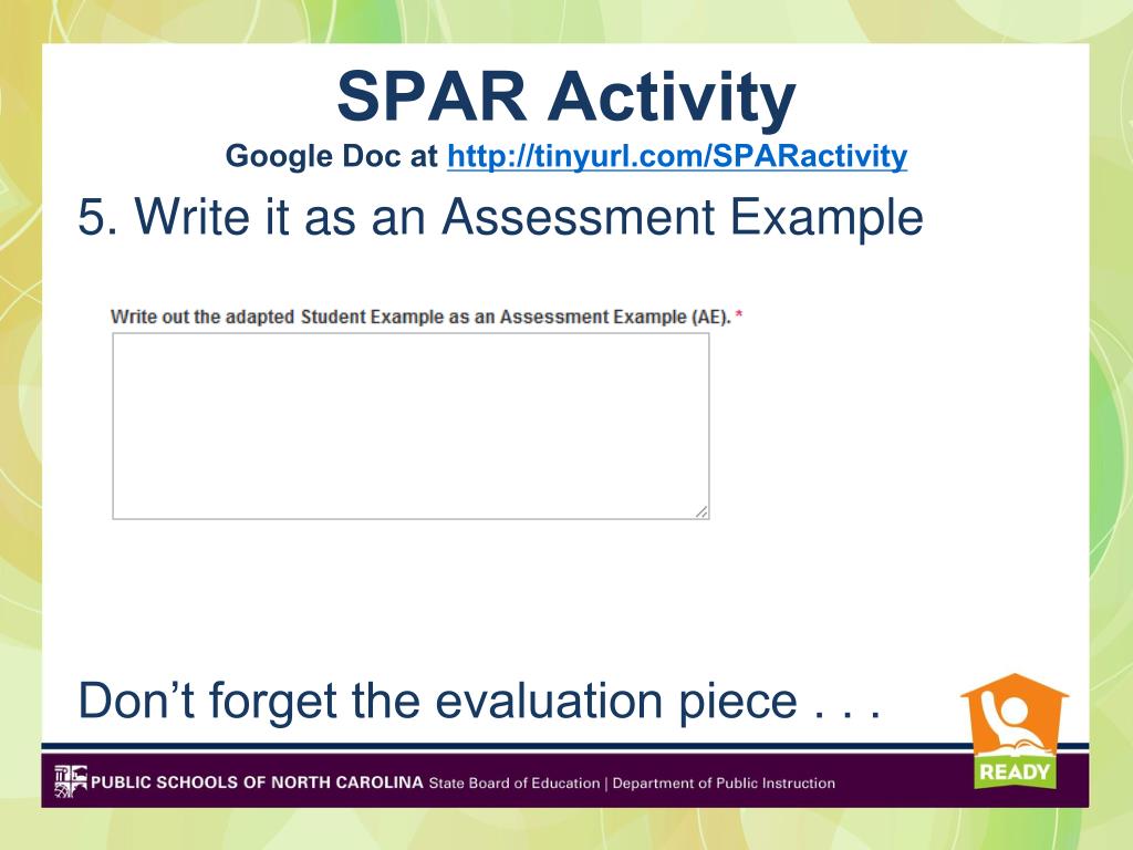 SPAR ActivityGoogle Doc at http://tinyurl.com/SPARactivity 5. Write it as an Assessment Example Don’t forget the evaluation piece . . .