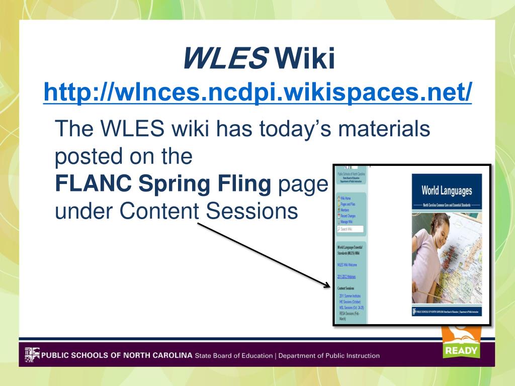 WLES Wikihttp://wlnces.ncdpi.wikispaces.net/ The WLES wiki has today’s materials posted on the FLANC Spring Fling pageunder Content Sessions