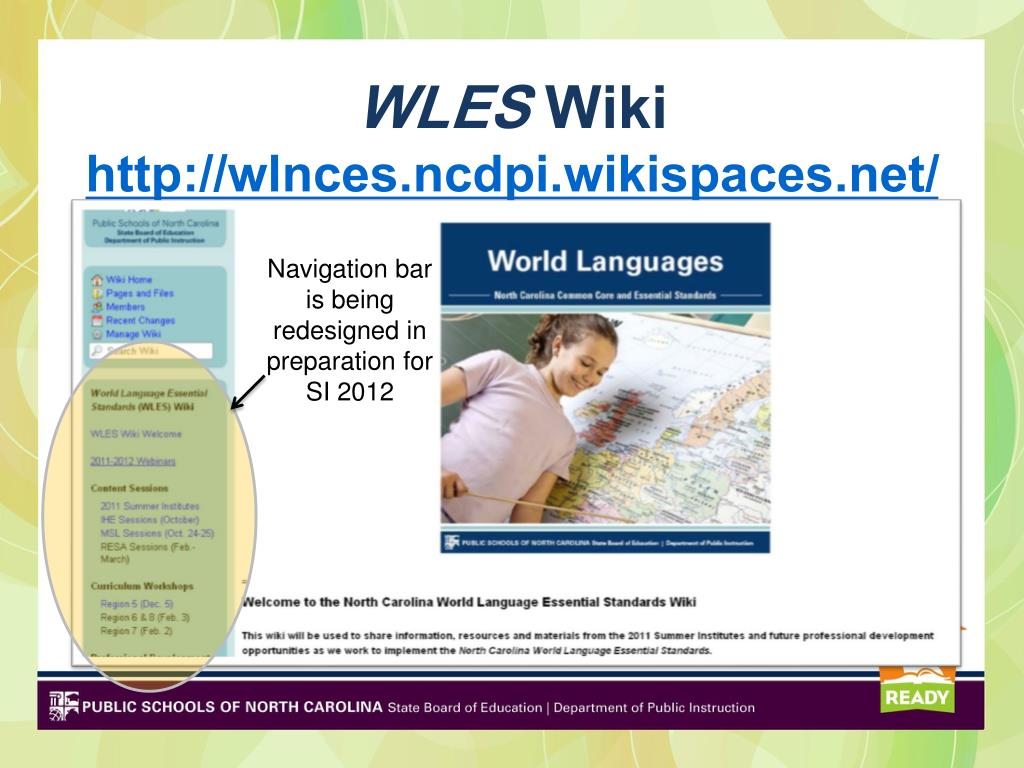 WLES Wikihttp://wlnces.ncdpi.wikispaces.net/ Navigation bar is being redesigned in preparation for SI 2012