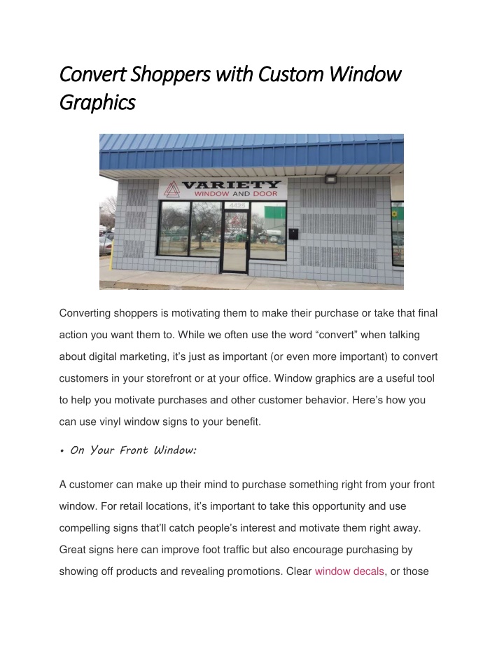 Convert Shoppers with Custom Window Convert Shoppers with Custom Window Graphics Graphics Converting shoppers is motivating them to make their purchase or take that final action you want them to. While we often use the word “convert” when talking about digital marketing, it’s just as important (or even more important) to convert customers in your storefront or at your office. Window graphics are a useful tool to help you motivate purchases and other customer behavior. Here’s how you can use vinyl window signs to your benefit. • On Your Front Window: A customer can make up their mind to purchase something right from your front window. For retail locations, it’s important to take this opportunity and use compelling signs that’ll catch people’s interest and motivate them right away. Great signs here can improve foot traffic but also encourage purchasing by showing off products and revealing promotions. Clear window decals, or those