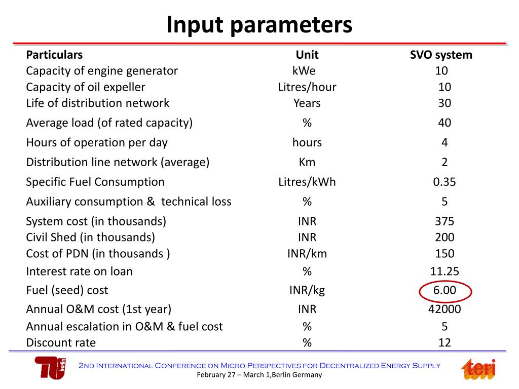 Methods • Estimation of Minimum Desired Price (MDP) of electricity under different operating conditions for ensuring viability of SVO systems • Based on actual field performance data collected from a number of projects implemented under VESP • Finding MDP from a consumer’s perspective and viability gap analysis to estimate any gap • Possible mechanisms to bridge the gap and suggest breakeven price under different scenarios • Suggests an integrated approach for ensuring long term ‘sustainable electrification’ with SVO systems as an option in the remote rural areas
