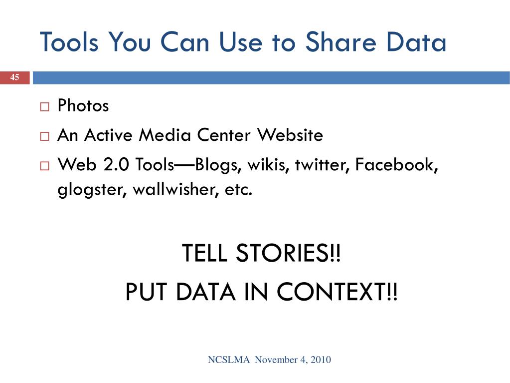 Tools You Can Use to Share Data • Photos • An Active Media Center Website • Web 2.0 Tools—Blogs, wikis, twitter, Facebook, glogster, wallwisher, etc. TELL STORIES!! PUT DATA IN CONTEXT!! NCSLMA November 4, 2010