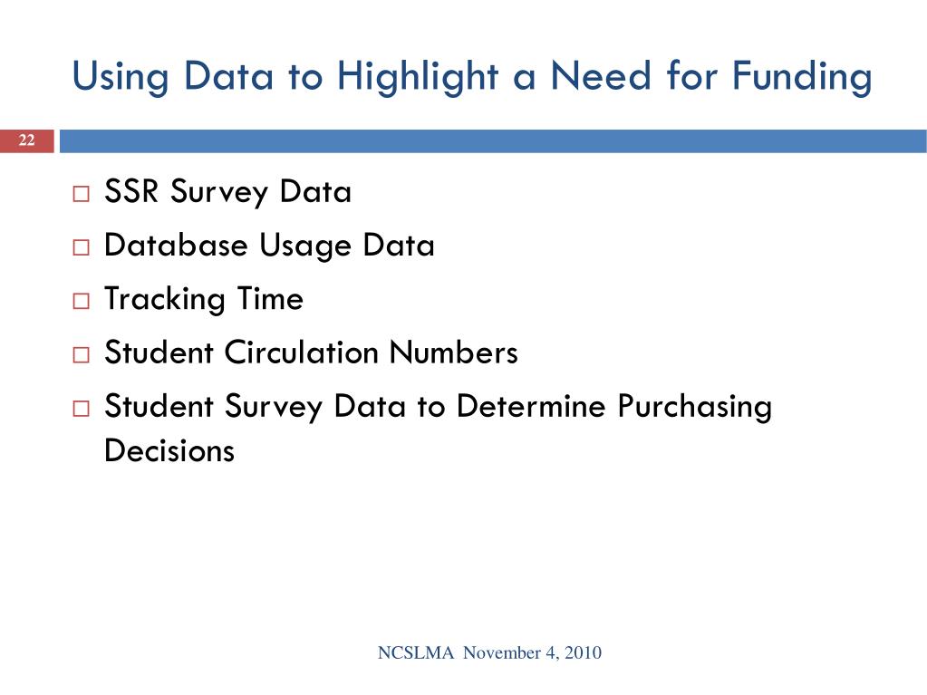 Using Data to Highlight a Need for Funding • SSR Survey Data • Database Usage Data • Tracking Time • Student Circulation Numbers • Student Survey Data to Determine Purchasing Decisions NCSLMA November 4, 2010