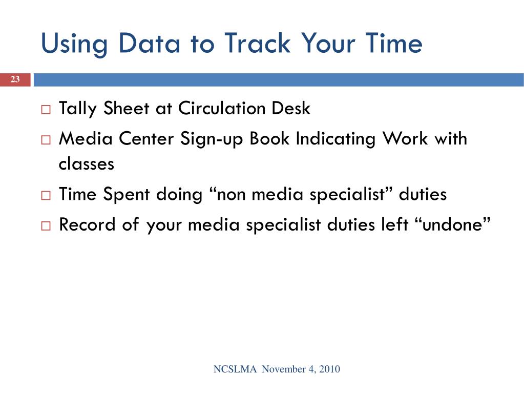 Using Data to Track Your Time • Tally Sheet at Circulation Desk • Media Center Sign-up Book Indicating Work with classes • Time Spent doing “non media specialist” duties • Record of your media specialist duties left “undone” NCSLMA November 4, 2010