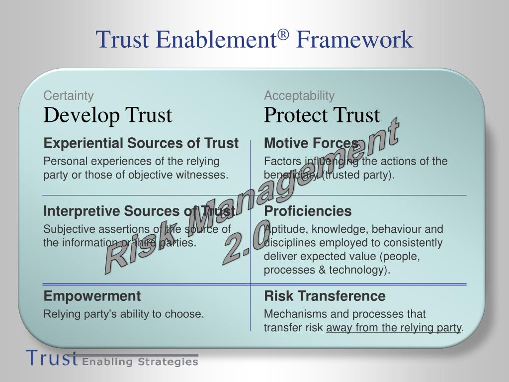 Certainty Acceptability Develop Trust Protect Trust Interpretive Sources of Trust Subjective assertions of the source of the information or third parties. Empowerment Relying party’s ability to choose. Trust Enablement®Framework Experiential Sources of Trust Personal experiences of the relying party or those of objective witnesses. Motive Forces Factors influencing the actions of the beneficiary (trusted party). Risk Management 2.0 Risk Management Proficiencies Aptitude, knowledge, behaviour and disciplines employed to consistently deliver expected value (people, processes & technology). Risk Transference Mechanisms and processes that transfer risk away from the relying party.