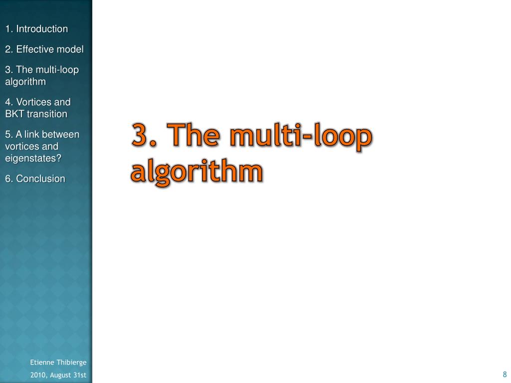 3. The multi-loop algorithm Etienne Thibierge 1. Introduction 2. Effective model 3. The multi-loop algorithm 4. Vortices and BKT transition 5. A link between vortices and eigenstates? 6. Conclusion
