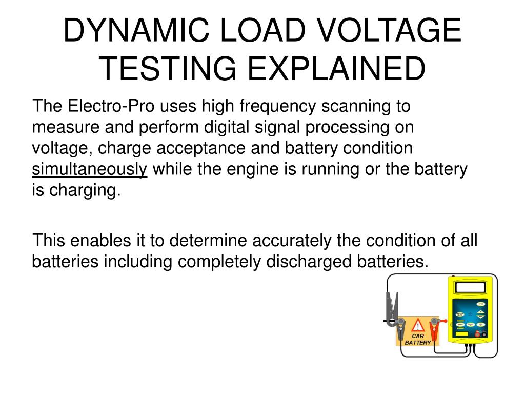 DYNAMIC LOAD VOLTAGE TESTING EXPLAINED The Electro-Pro uses high frequency scanning to measure and perform digital signal processing on voltage, charge acceptance and battery condition simultaneously while the engine is running or the battery is charging. This enables it to determine accurately the condition of all batteries including completely discharged batteries.