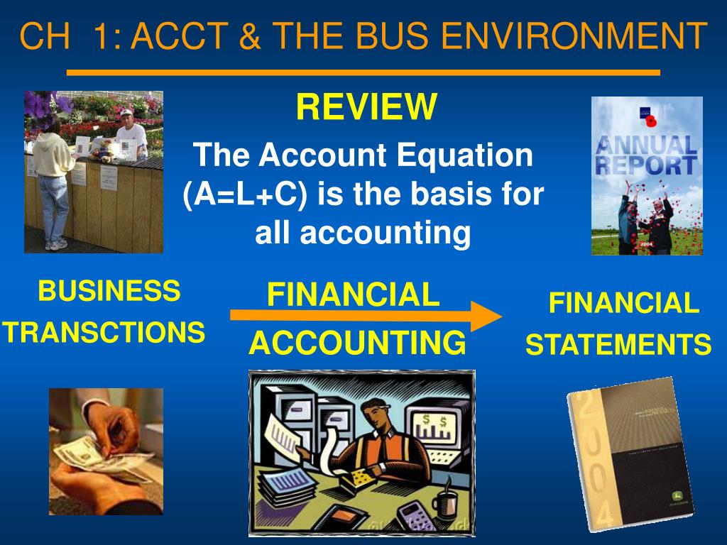 CH 1: ACCT & THE BUS ENVIRONMENT REVIEW The Account Equation (A=L+C) is the basis for all accounting FINANCIAL BUSINESSTRANSCTIONS FINANCIALSTATEMENTS ACCOUNTING