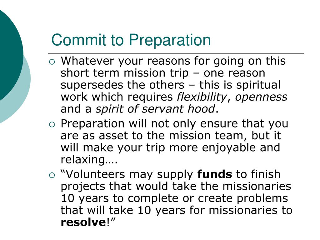 Commit to Preparation • Whatever your reasons for going on this short term mission trip – one reason supersedes the others – this is spiritual work which requires flexibility, openness and a spirit of servant hood. • Preparation will not only ensure that you are as asset to the mission team, but it will make your trip more enjoyable and relaxing…. • “Volunteers may supply funds to finish projects that would take the missionaries 10 years to complete or create problems that will take 10 years for missionaries to resolve!”