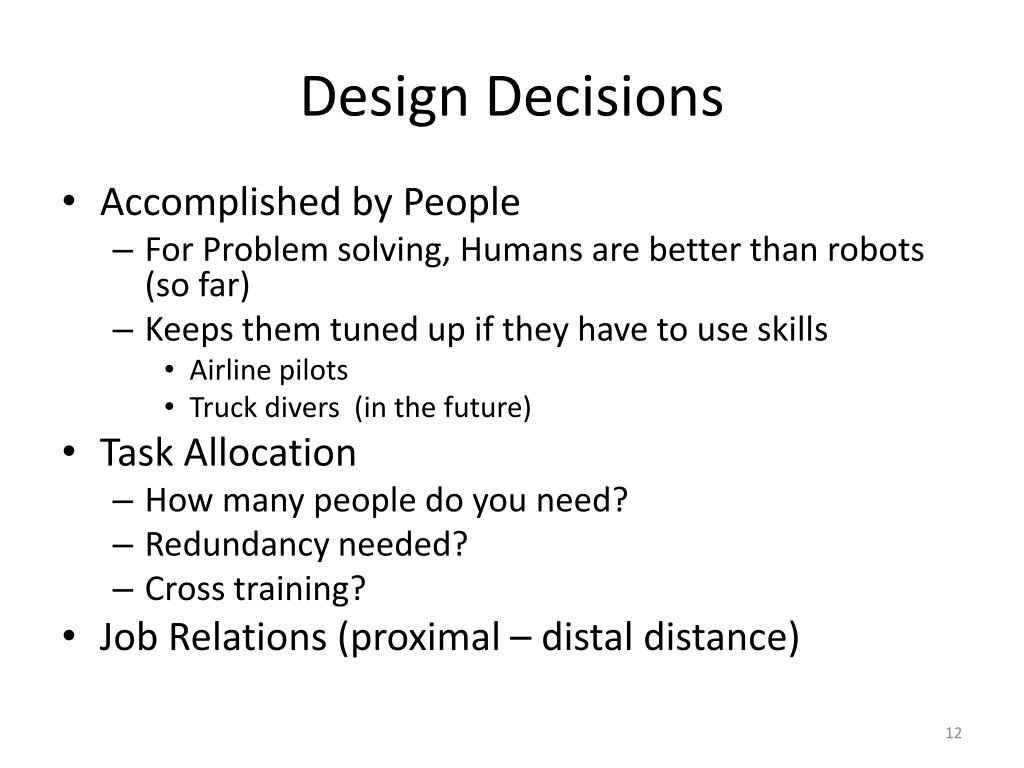 Design Decisions • Accomplished by People • For Problem solving, Humans are better than robots (so far) • Keeps them tuned up if they have to use skills • Airline pilots • Truck divers (in the future) • Task Allocation • How many people do you need? • Redundancy needed? • Cross training? • Job Relations (proximal – distal distance)