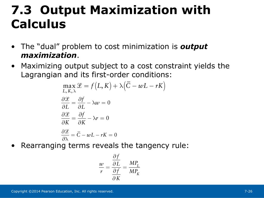 7.3 Output Maximization with Calculus • The “dual” problem to cost minimization is output maximization. • Maximizing output subject to a cost constraint yields the Lagrangian and its first-order conditions: • Rearranging terms reveals the tangency rule: