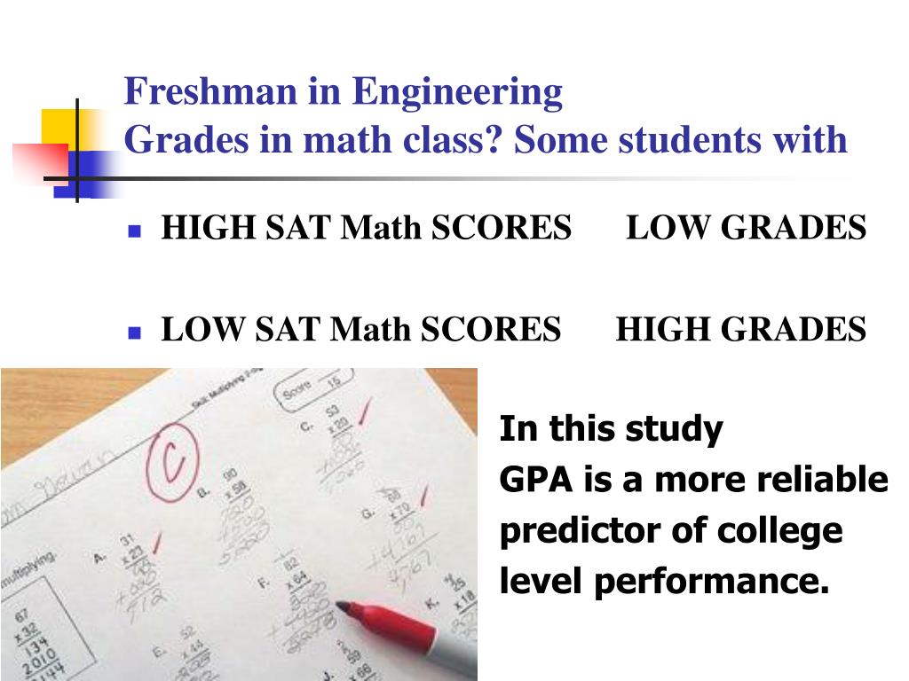 Freshman in EngineeringGrades in math class? Some students with • HIGH SAT Math SCORES LOW GRADES • LOW SAT Math SCORES HIGH GRADES In this study GPA is a more reliable predictor of college level performance.