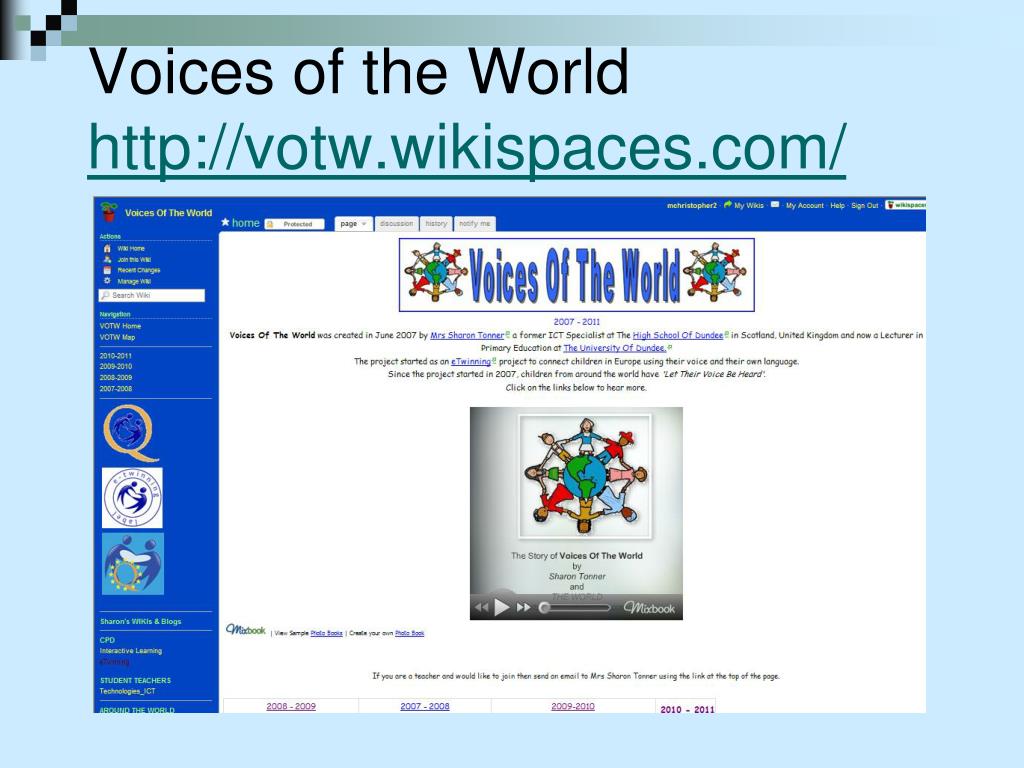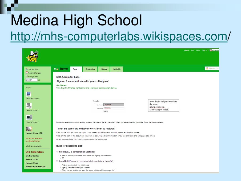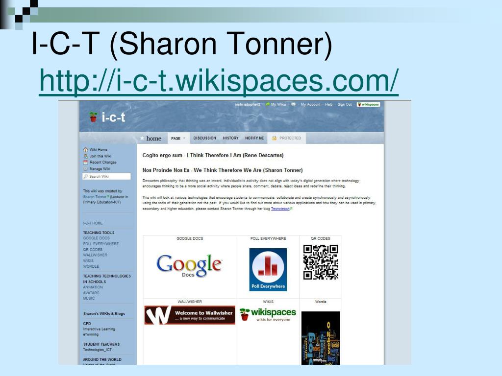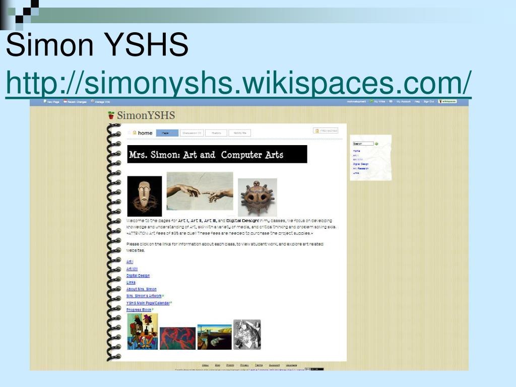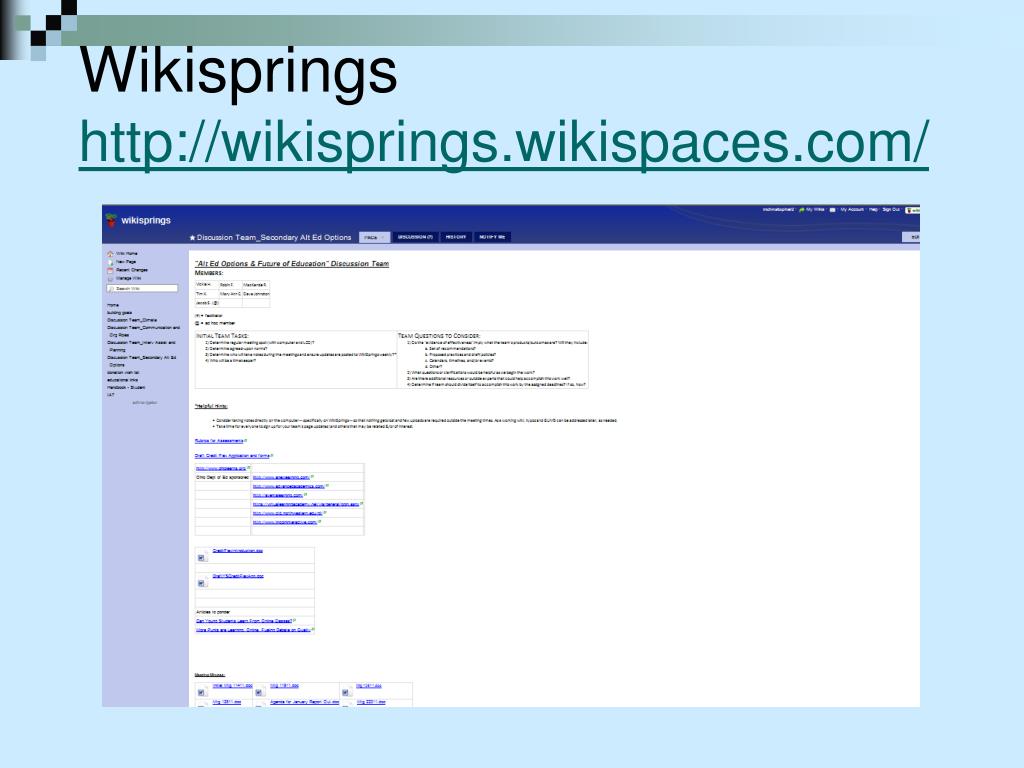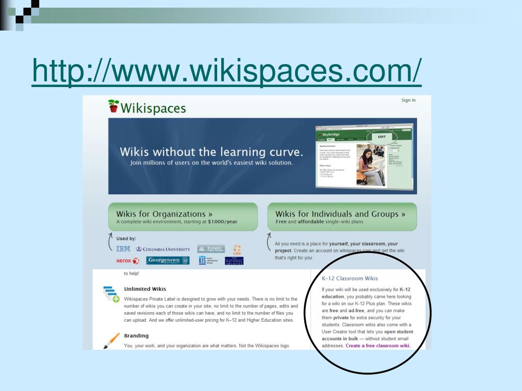 Wiki + teachers = wikispaces Free wikis to educators March 2009: 100,000 January 2011: 406, 291 Uses Teacher Webpage Calendar Email parents Classroom pages Syllabus and contact information Lessons and assignments Links Class discussions (with tracking)