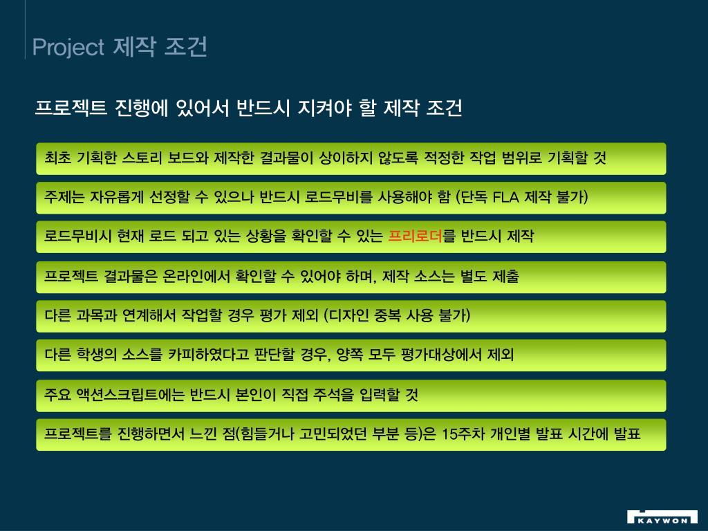 프로젝트 진행에 있어서 반드시 지켜야 할 제작 조건 Project 제작 조건 최초 기획한 스토리 보드와 제작한 결과물이 상이하지 않도록 적정한 작업 범위로 기획할 것 주제는 자유롭게 선정할 수 있으나 반드시 로드무비를 사용해야 함 (단독 FLA 제작 불가) 로드무비시 현재 로드 되고 있는 상황을 확인할 수 있는 프리로더를 반드시 제작 프로젝트 결과물은 온라인에서 확인할 수 있어야 하며, 제작 소스는 별도 제출 다른 과목과 연계해서 작업할 경우 평가 제외 (디자인 중복 사용 불가) 다른 학생의 소스를 카피하였다고 판단할 경우, 양쪽 모두 평가대상에서 제외 주요 액션스크립트에는 반드시 본인이 직접 주석을 입력할 것 프로젝트를 진행하면서 느낀 점(힘들거나 고민되었던 부분 등)은 15주차 개인별 발표 시간에 발표