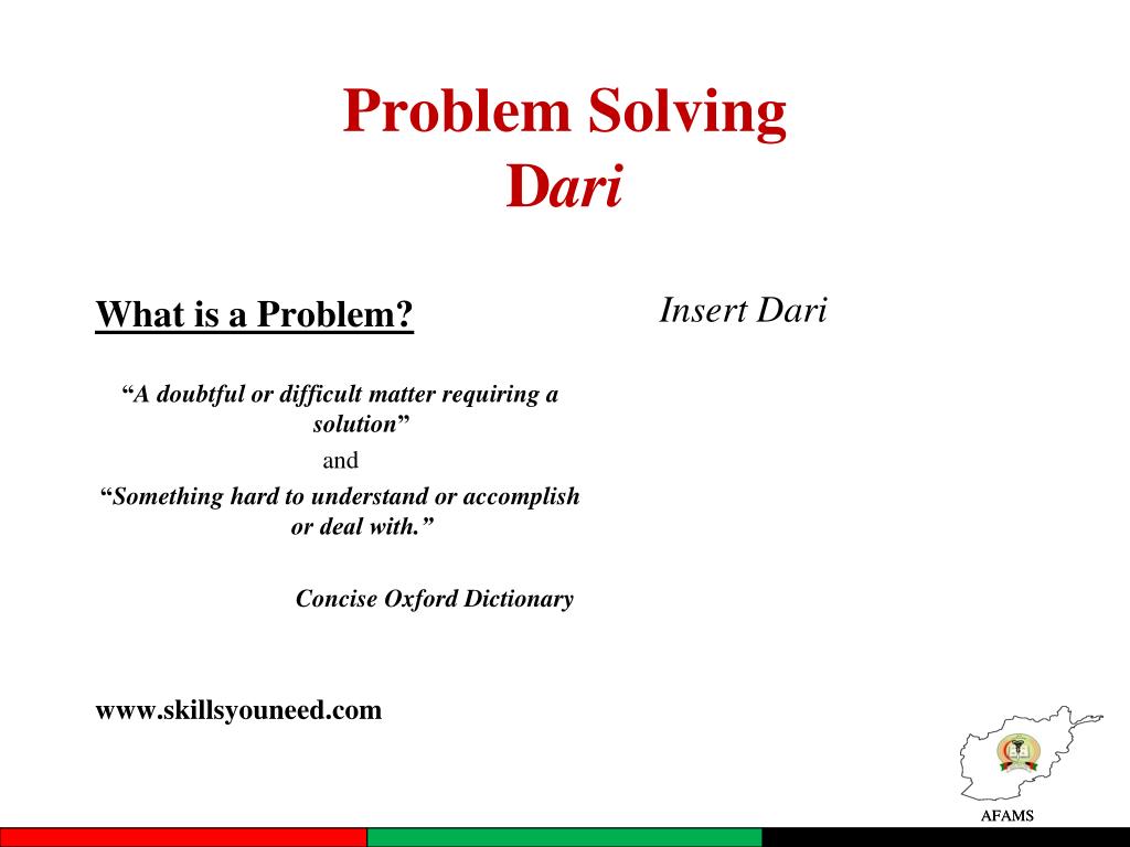 Problem SolvingDari What is a Problem? “A doubtful or difficult matter requiring a solution” and “Something hard to understand or accomplish or deal with.” Concise Oxford Dictionary www.skillsyouneed.com • Insert Dari AFAMS