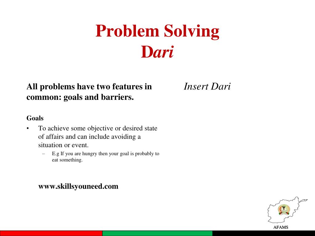 Problem SolvingDari All problems have two features in common: goals and barriers. Goals • To achieve some objective or desired state of affairs and can include avoiding a situation or event. • E.g If you are hungry then your goal is probably to eat something. www.skillsyouneed.com • Insert Dari AFAMS
