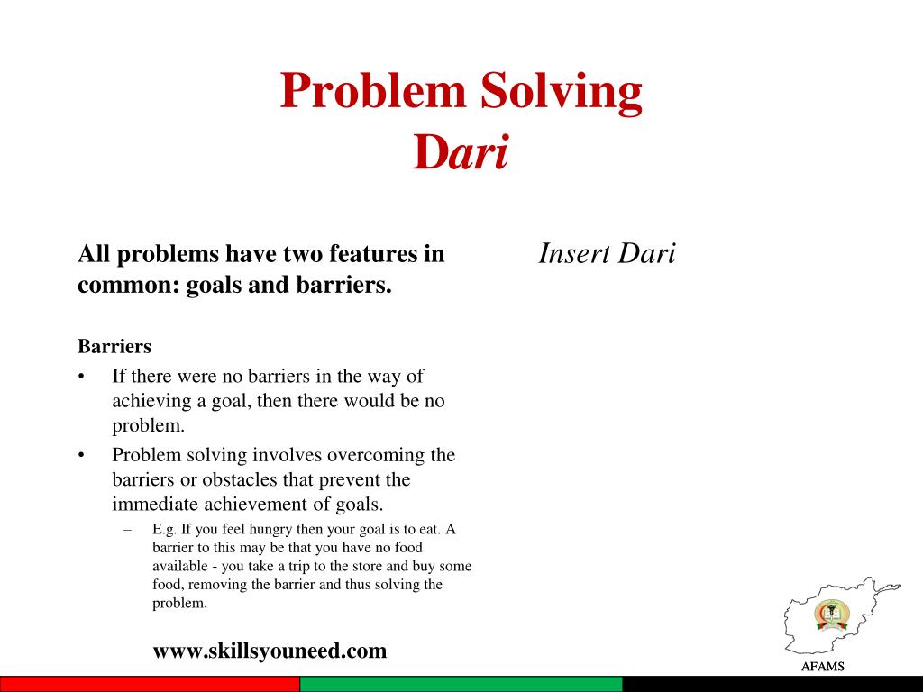 Problem SolvingDari “Everybody can benefit from having good problem solving skills as we all encounter problems on a daily basis; some of these problems are obviously more severe or complex than others.”www.skillsyouneed.com • Insert Dari AFAMS