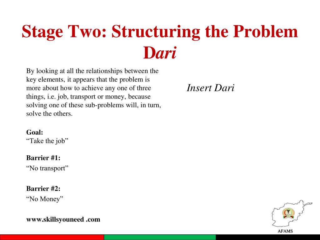 Stage Two: Structuring the ProblemDari The second stage of the problem solving process involves gaining a deeper understanding of the problem. Firstly, facts need to be checked. Problem: “I want to take a job, but I don’t have the transport to get there and I don’t have enough money to buy a car.”Checking Facts: “Do I really want a job?”“Do I really have no access to transport?”“Can I really not afford to buy a car?”www.skillsyouneed .com • Insert Dari AFAMS