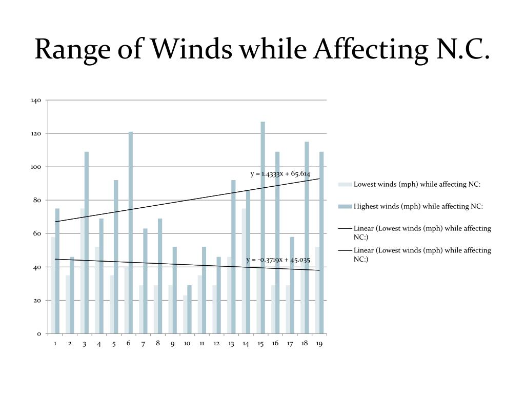 Highest Wind Speeds in NC 16 – Hallie 22 – Isabel 24 – Subtrop 25 – How, Kara, Unnamed 26 – Isidore 31 – Kyle 35 – Isbell 40 – Kate 43 – Irene 45 – Gladys 55 – Josephine 57 – Sandy 63 – Hazel