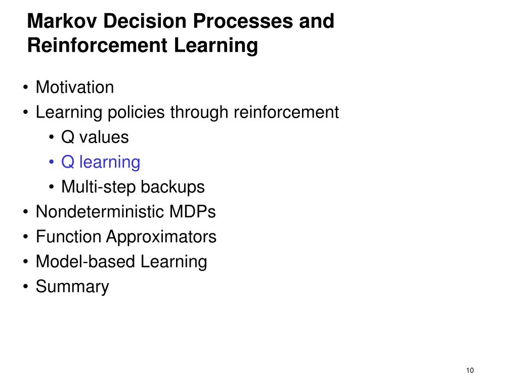 Markov Decision Processes and Reinforcement Learning • Motivation • Learning policies through reinforcement • Q values • Q learning • Multi-step backups • Nondeterministic MDPs • Function Approximators • Model-based Learning • Summary