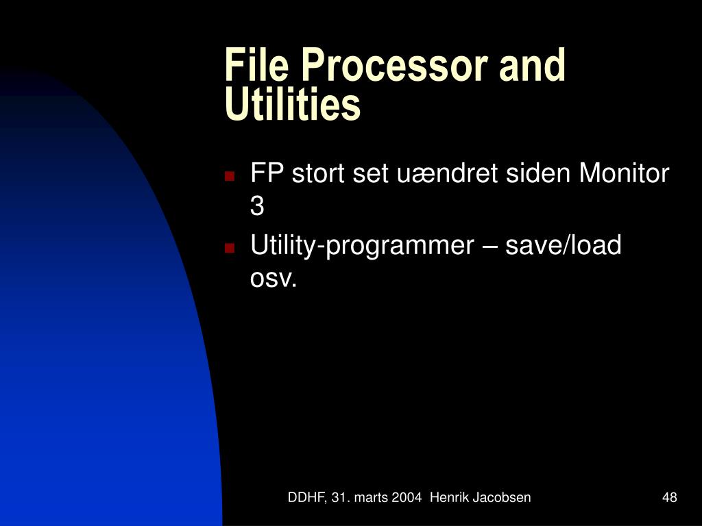 File Processor and Utilities • FP stort set uændret siden Monitor 3 • Utility-programmer – save/load osv. DDHF, 31. marts 2004 Henrik Jacobsen