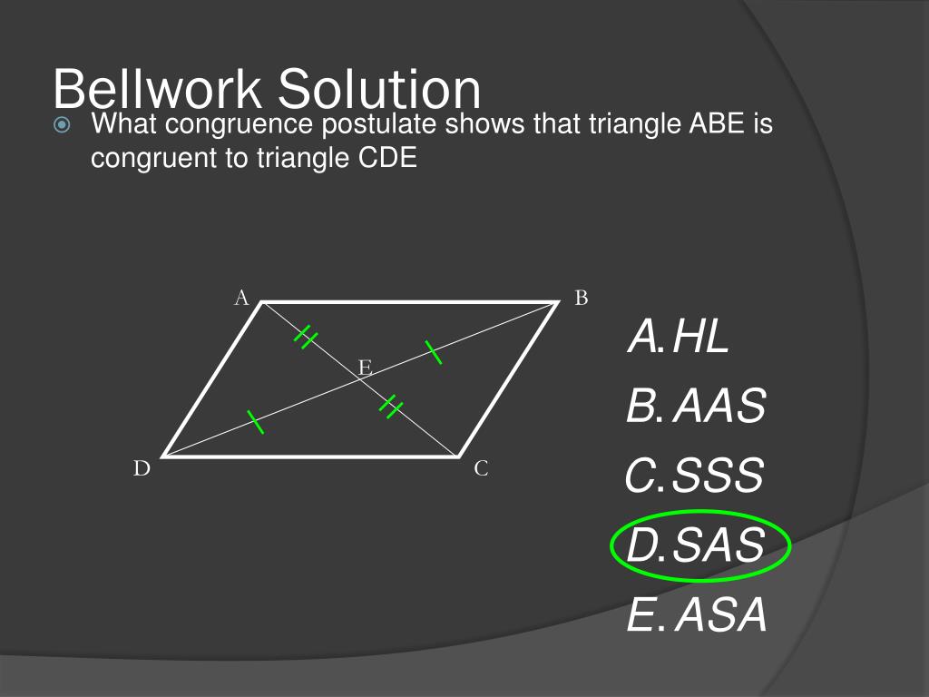 Bellwork Solution • What congruence postulate shows that triangle ABE is congruent to triangle CDE A B E D C