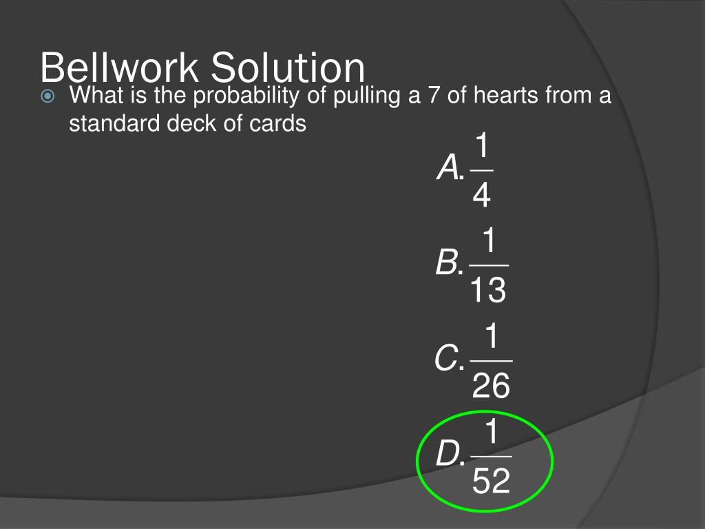 Bellwork Solution • What is the probability of pulling a 7 of hearts from a standard deck of cards