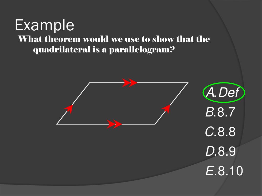 Theorems Theorem 8.7: If both pairs of opposite sides of a quadrilateral are congruent, then the quadrilateral is a parallelogram Theorem 8.8: If both pairs of opposite angles of a quadrilateral are congruent, then the quadrilateral is a parallelogram Aren’t these just the converses of Theorems 8.3, 8.4, 8.5 & 8.6?