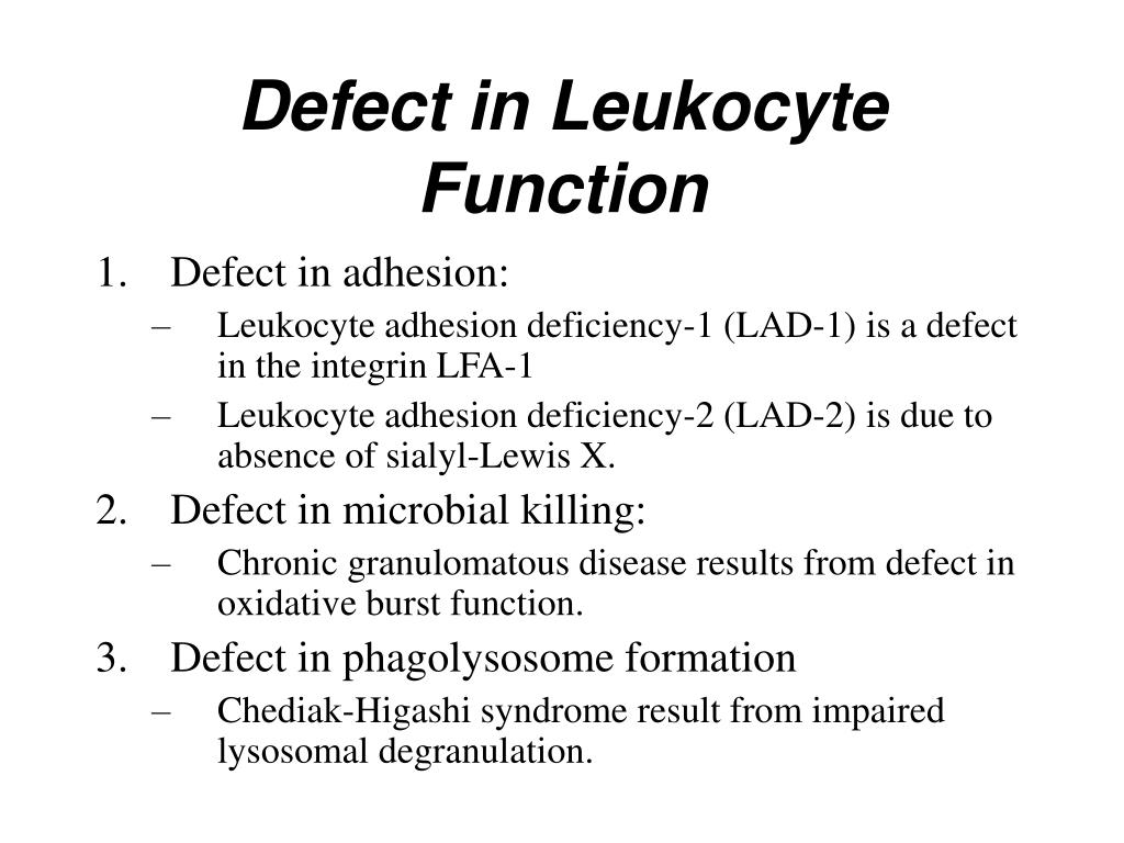 Defect in Leukocyte Function • Defect in adhesion: • Leukocyte adhesion deficiency-1 (LAD-1) is a defect in the integrin LFA-1 • Leukocyte adhesion deficiency-2 (LAD-2) is due to absence of sialyl-Lewis X. • Defect in microbial killing: • Chronic granulomatous disease results from defect in oxidative burst function. • Defect in phagolysosome formation • Chediak-Higashi syndrome result from impaired lysosomal degranulation.